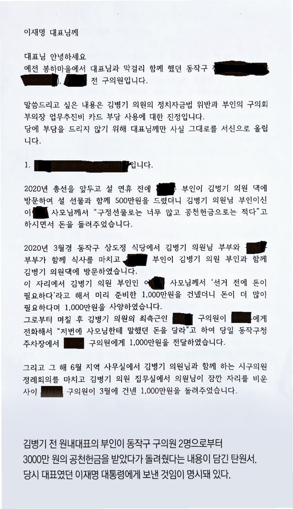 A.2020년 총선을 앞두고 공천 헌금을 수수한 의혹을 받고 있습니다. 탄원서에는 김 전 원내대표 부인이 구의원들에게 금품을 받았다는 내용이 담겨 있습니다.