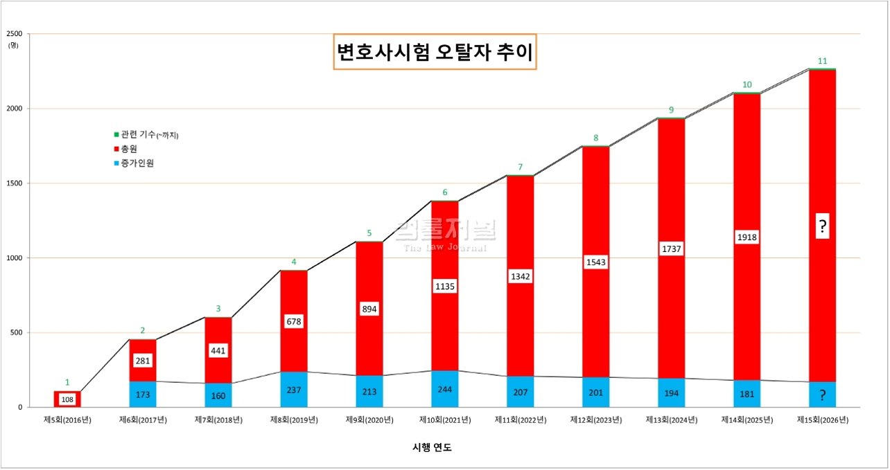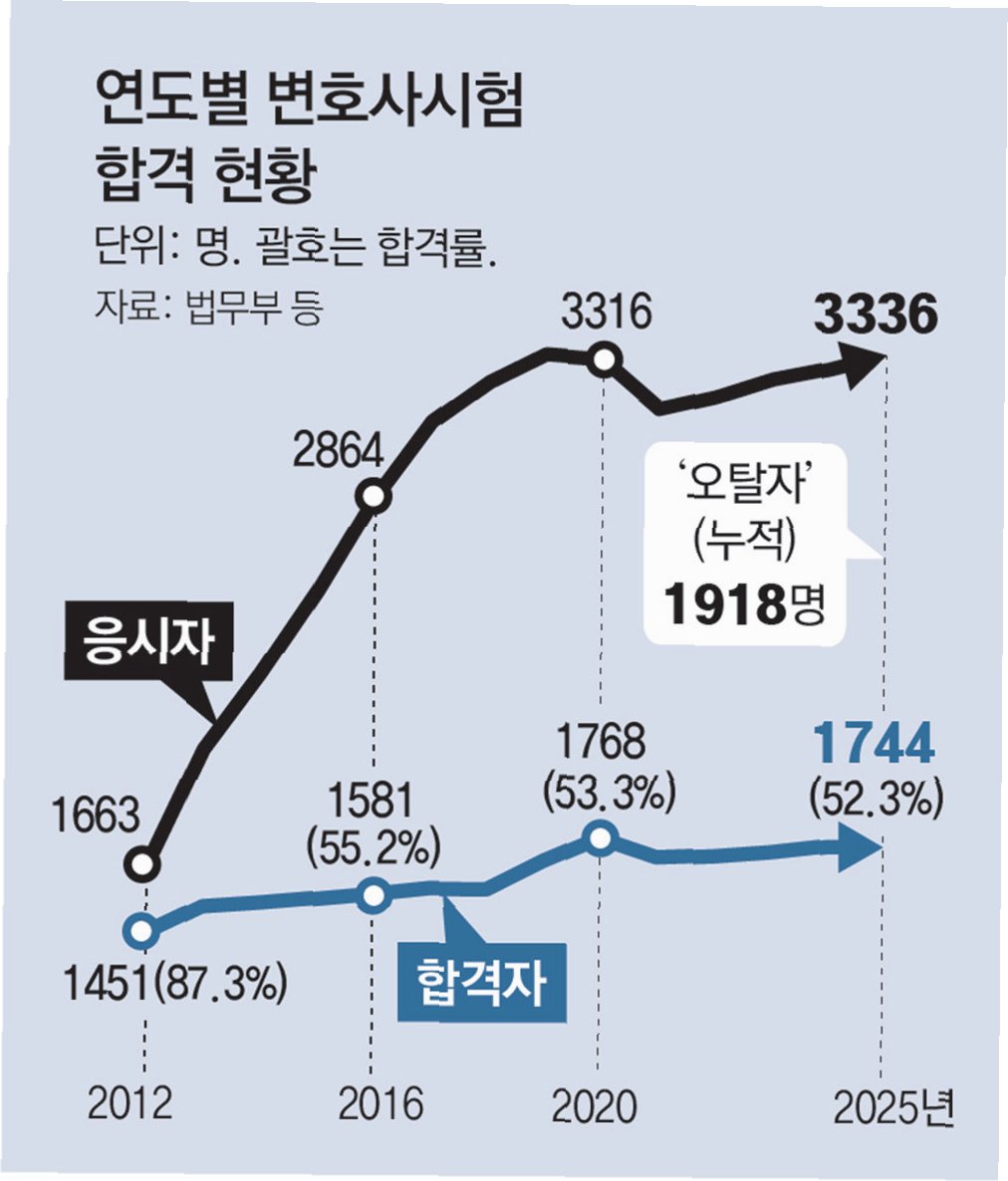 현재 등록 변호사가 3만 8천 명을 넘어서고, 최근 변호사시험 합격자까지 더하면 4만 명에 육박하는 시대가 되었습니다. 하지만 역대 세 번째로 낮은 합격률을 기록하며, 졸업 후 5년 안에 변호사시험에 통과하지 못해 응시 자격마저 잃은 '오탈자'가 2천 명을 넘어섰습니다. 이는 로스쿨 도입 17년 만에 제도의 한계를 드러내는 심각한 문제입니다. 변호사 공급 과잉에 대한 우려와 높아지는 합격 문턱 앞에서 법조계의 한숨이 깊어지고 있습니다.