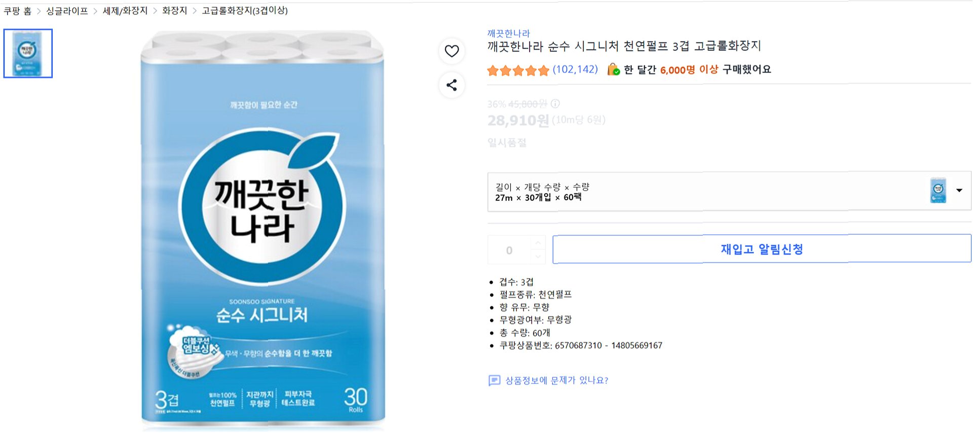 A.네, '깨끗한나라 순수 시그니처 천연펄프 3겹 고급롤 화장지'(27m, 30개입, 60팩)가 일시적으로 2만 8천원대에 올라와 1,800롤이 해당 가격에 판매될 뻔했습니다.