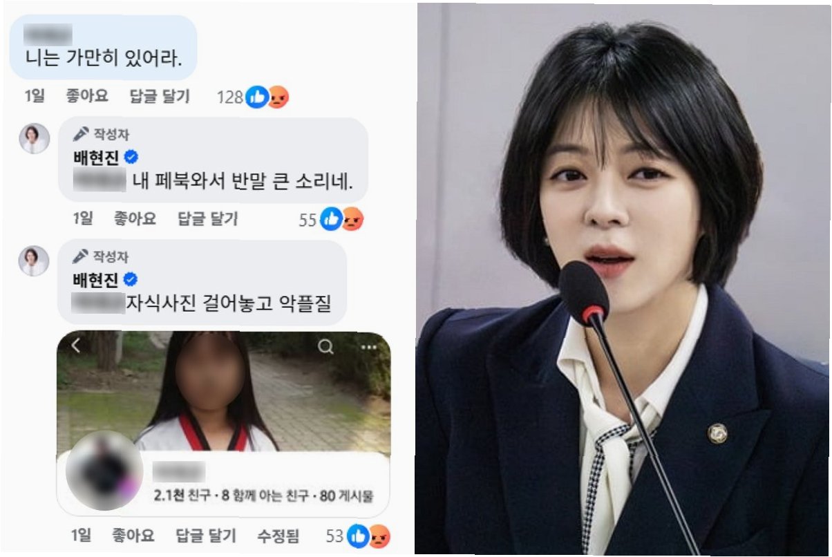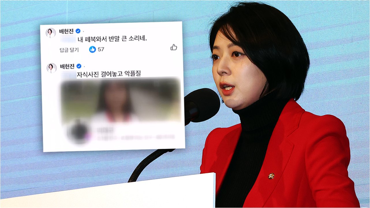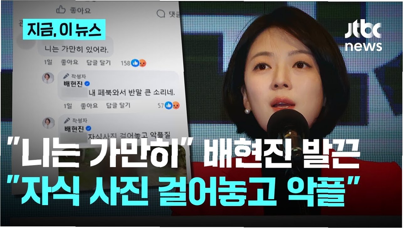 국민의힘 배현진 의원이 자신의 페이스북에 달린 '니는 가만히 있어라'는 댓글에 대해, 댓글 작성자의 자녀 사진을 공개하며 '자식 사진 걸어놓고 악플질'이라고 응수해 논란이 일고 있습니다. 이는 단순한 설전을 넘어선 신상털기라는 비판과 함께 과도한 대응이라는 지적이 제기되고 있습니다. 배 의원은 해당 댓글 작성자의 프로필에 공개된 여자아이의 사진을 캡처하여 공개했습니다.