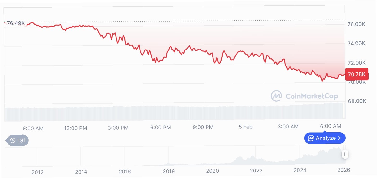 A.비트코인은 지난해 사상 최고치를 기록한 이후 42% 이상 급락했으며, 최근에는 7만 달러 선마저 위협받고 있습니다.