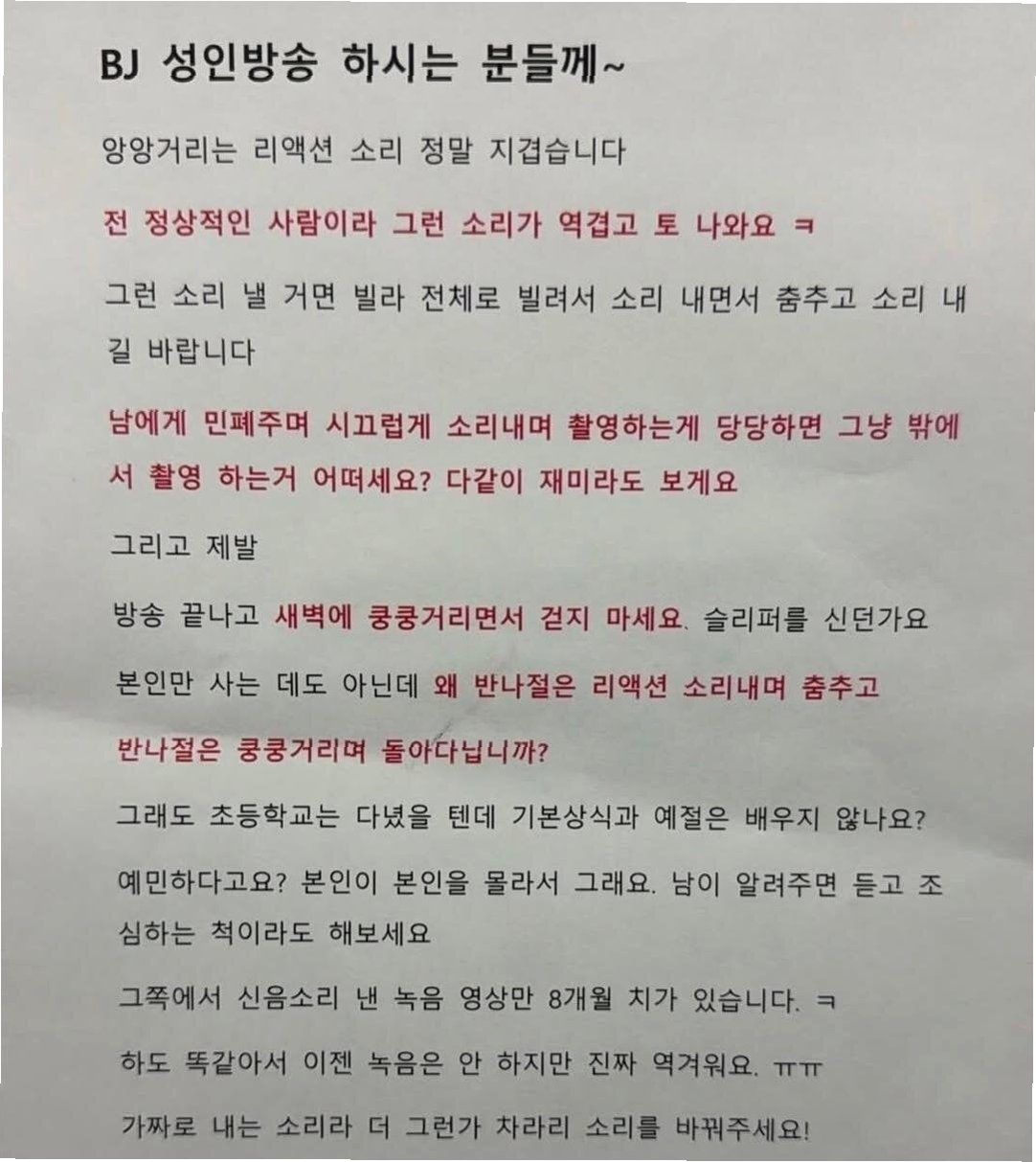 공동주택에서 성인방송으로 인한 소음 문제로 이웃 간의 갈등이 심화되고 있습니다. 온라인 커뮤니티에 올라온 한 게시글은 이러한 현실을 생생하게 보여주며, 많은 이들의 공감을 얻고 있습니다. 게시글 작성자 A 씨는 BJ의 성인방송 리액션 소리에 극심한 고통을 호소하며, 정상적인 사람이라면 역겨움을 느낄 정도라고 말했습니다. 특히 새벽 시간대의 생활 소음까지 더해져 일상생활이 불가능할 지경이라고 토로했습니다. A 씨는 8개월 동안 녹음한 소음 파일을 증거로 제시하며, 이웃들의 고통을 간접적으로 보여주고 있습니다.