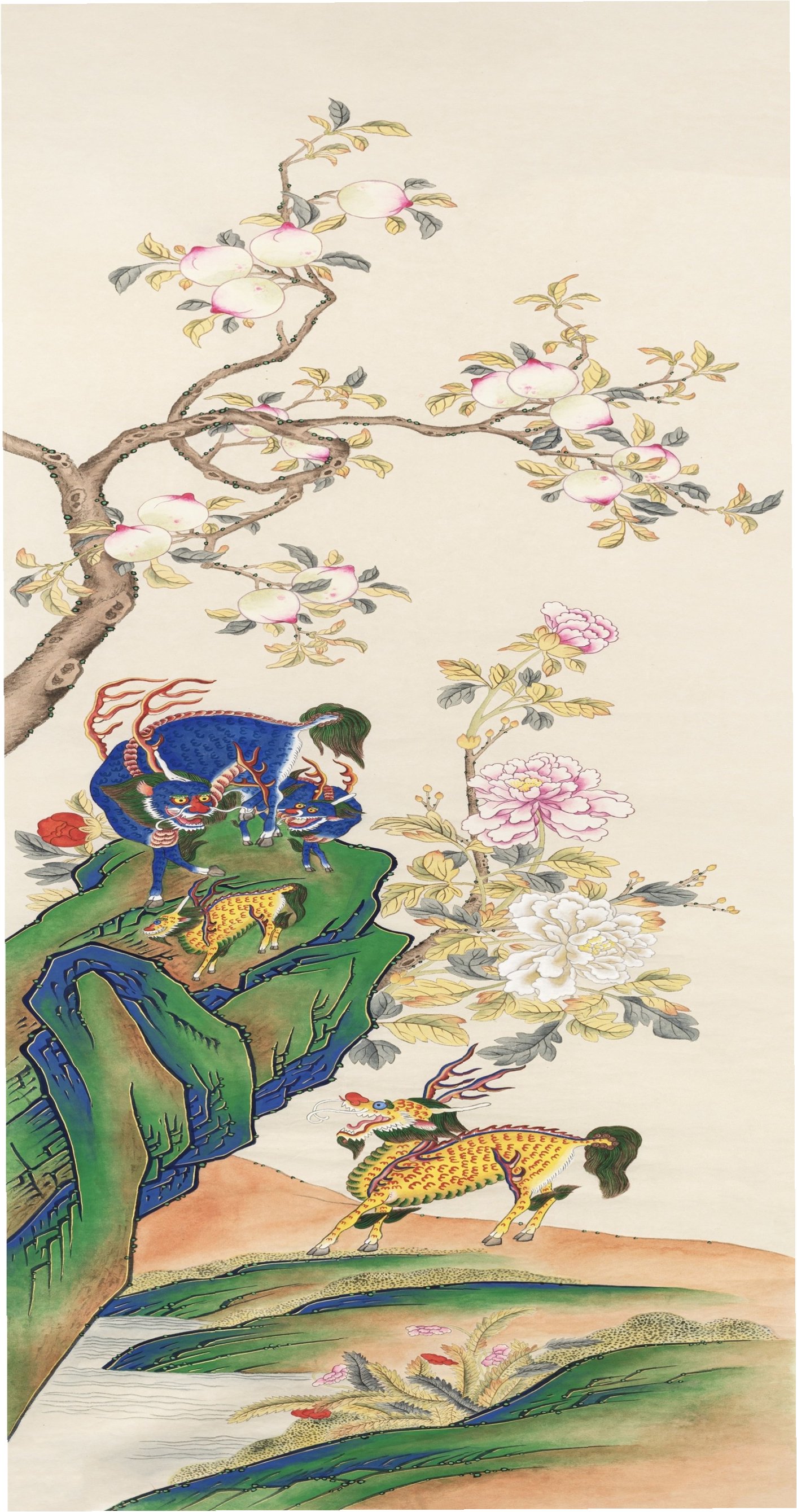 A.기린은 상상 속 동물로, 성인의 출현, 태평성대, 자손 번창을 상징하며, 천도복숭아는 장수를, 모란꽃은 부귀영화를 의미합니다.