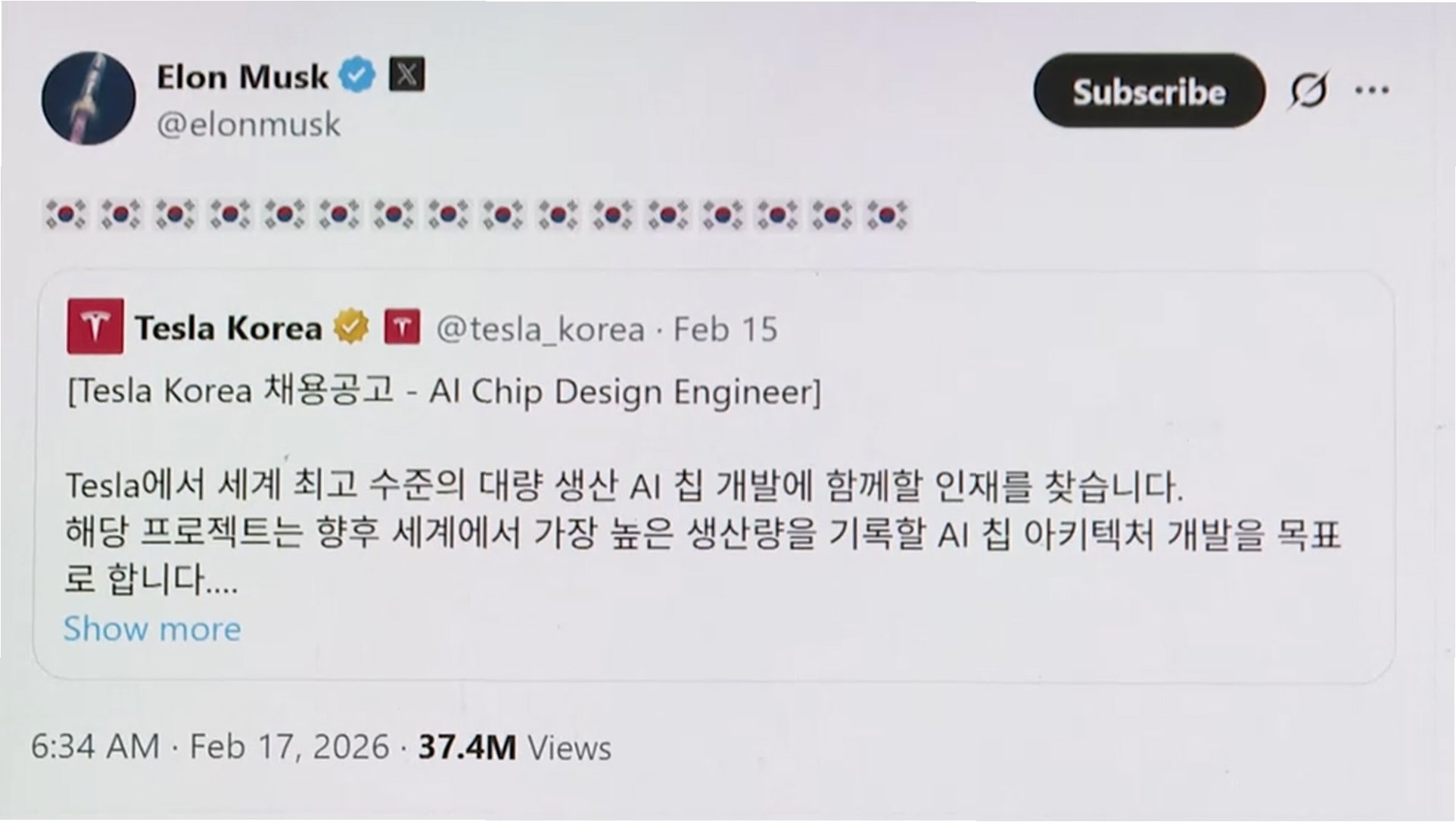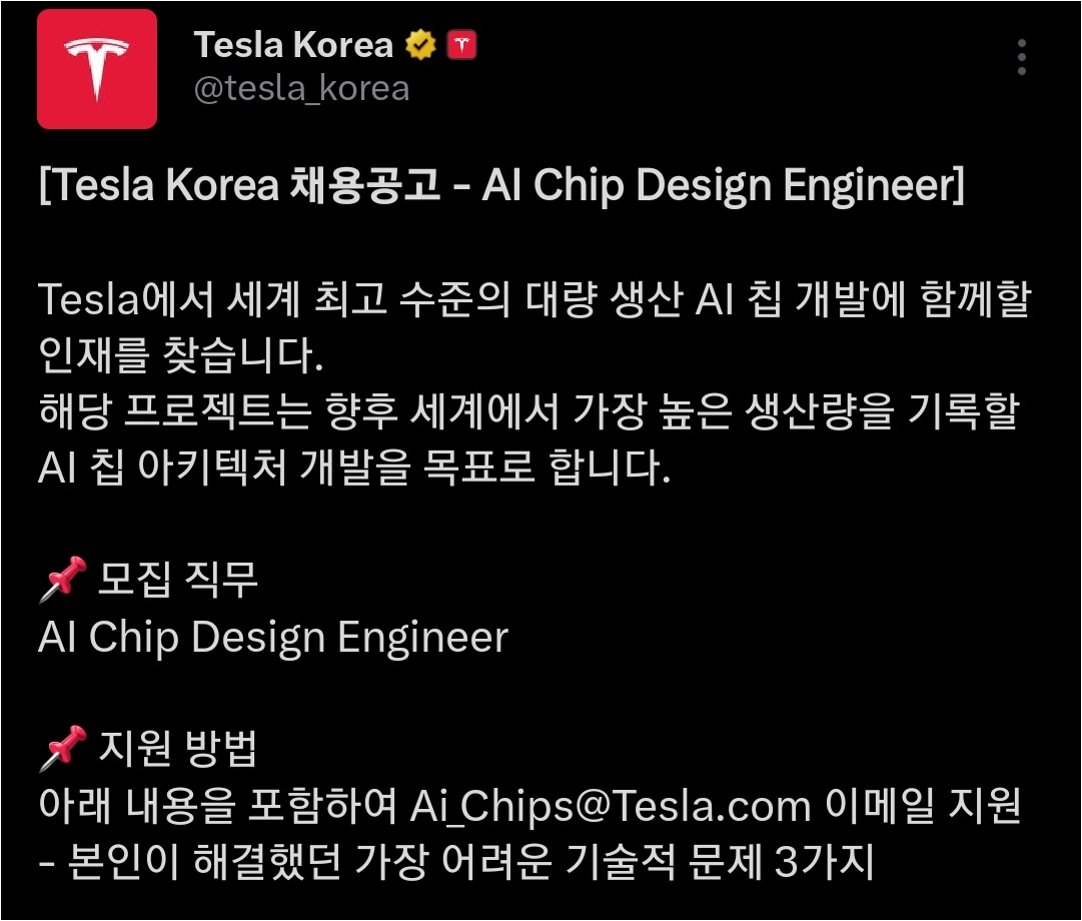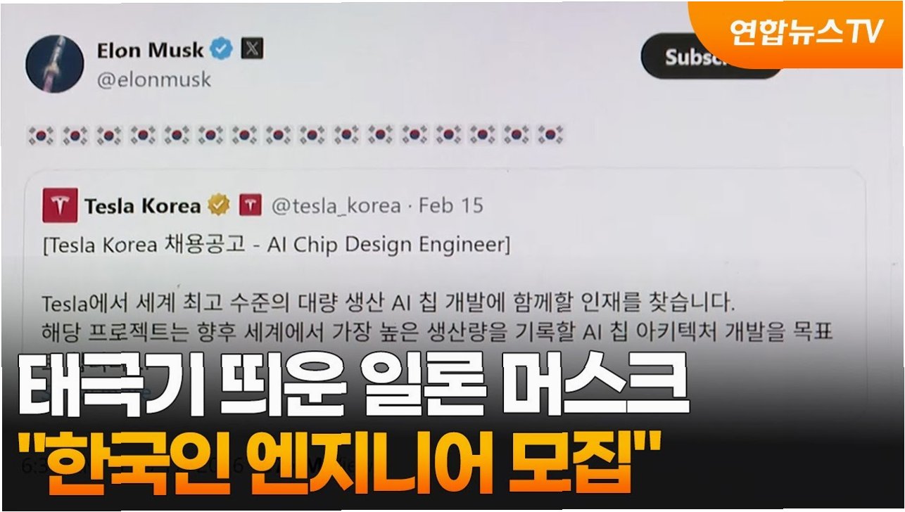 일론 머스크 테슬라 CEO가 한국의 우수한 AI 인재들에게 테슬라 합류를 제안했습니다. 머스크는 자신의 SNS에 테슬라코리아의 AI 칩 디자인 엔지니어 채용 공고를 공유하며 16개의 태극기 이모티콘을 덧붙였습니다. 이는 한국의 반도체 기술력과 인재에 대한 그의 관심을 보여주는 상징적인 행동으로 해석됩니다.