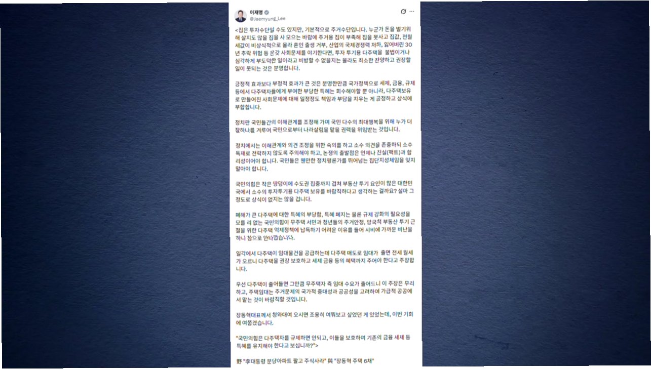 이재명 대통령은 장동혁 대표에게 '다주택자를 규제하면 안 되고, 금융 세제 등 특혜를 유지해야 한다고 보시느냐'는 질문을 던졌습니다. 이는 지난해 10월 공직자윤리위원회가 공개한 장 대표의 재산 변동사항과 관련이 있습니다. 장 대표는 서울 구로동 아파트와 충남 보령의 단독주택 등 총 6채의 주택 지분을 소유하고 있으며, 이에 대해 실거주용이거나 다른 목적을 가지고 있다고 해명한 바 있습니다.