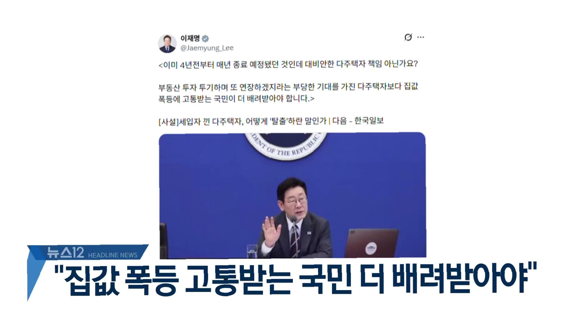 국민의힘 장동혁 대표가 이재명 대통령을 향해 “다주택자를 무조건 사회악으로 규정하고 소셜미디어(SNS) 선동에 매진하는 대통령의 모습이 참으로 애처롭기도 하고 우려스럽기도 하다”고 비판했다. 장 대표는 이 대통령의 SNS 정치를 언급하며, 국가원수로서의 품격이 부족하고 국민을 편 가르기 하는 ‘선거 브로커’ 같다고 지적했다.