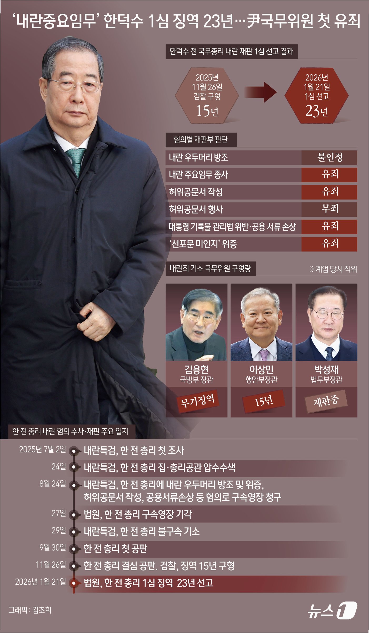 A.한덕수 전 총리는 '내란 중요임무종사' 혐의 대부분이 유죄로 인정되었습니다. 재판부는 12·3 불법계엄을 내란으로 규정하고, 국헌문란의 목적을 미필적으로 인식했음에도 불구하고, 비상계엄 선포를 저지해야 할 의무를 다하지 않은 점을 지적했습니다.