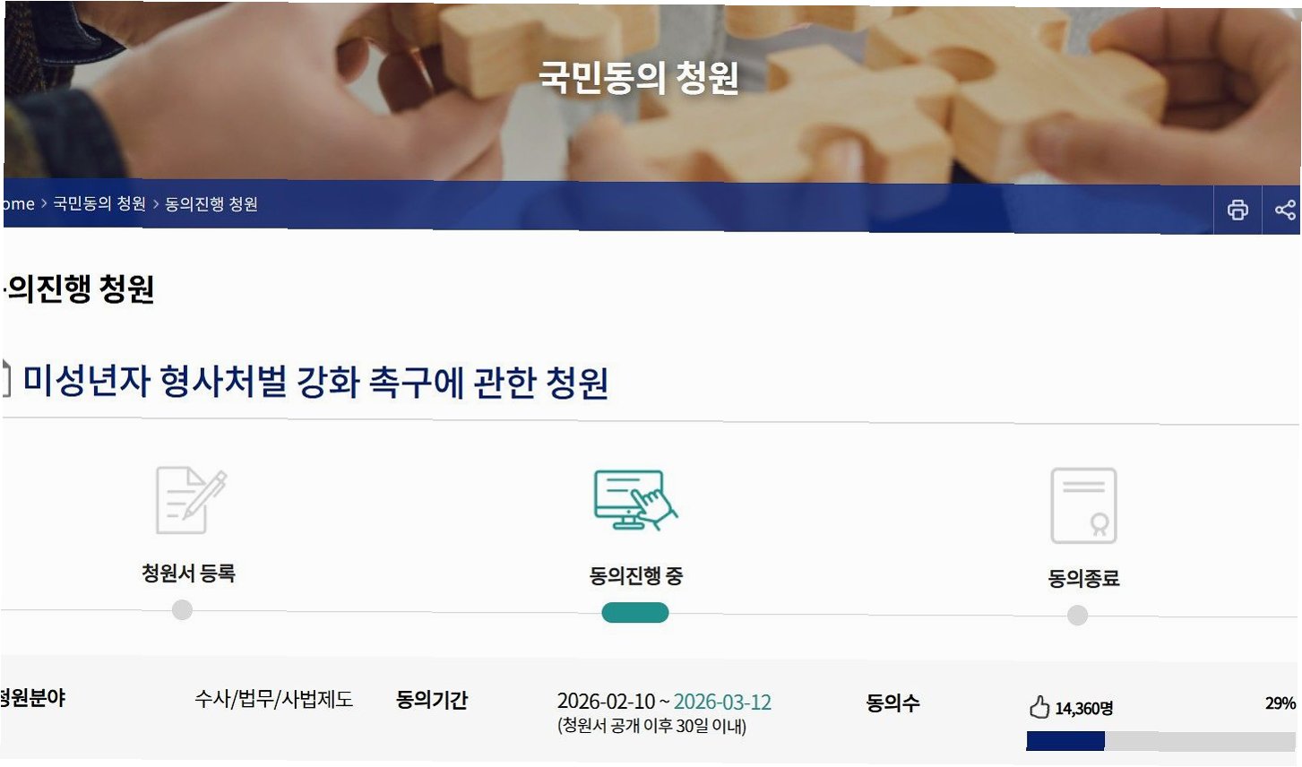 A.국민청원 홈페이지에 접속하여 '미성년자 형사처벌 강화 촉구에 관한 청원'을 검색하신 후 동의 버튼을 누르시면 됩니다. 30일 안에 5만 명의 동의를 달성하면 국회에 청원이 회부됩니다.