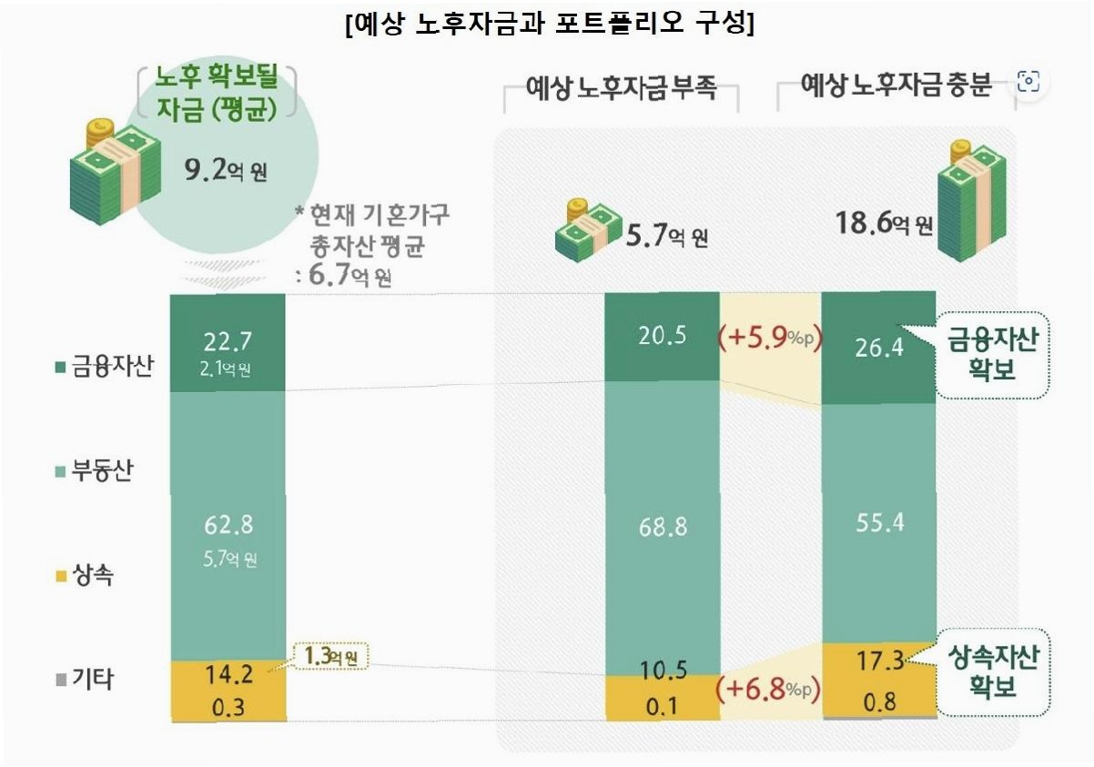 자녀 유학비는 현재 소득이 유지되는 기간까지는 큰 부담이 아닐 수 있지만, 은퇴 이후에는 상황이 달라집니다. 현재 순지출이 월 820만원 수준이라는 점을 감안하면, 은퇴 후에는 추가적인 월 현금 흐름 창출이 필수적입니다. 최근에는 변동성을 낮추면서도 월 단위 배당이 가능한 자산이 다양해졌습니다. 미국 투자등급·하이일드 채권, AAA급 부동산 대출 채권에 투자하는 대출채권담보부증권(CLO) 자산, 배당률이 높은 상장 리츠 등이 대표적입니다. 또한, 연금 자산 역시 재점검이 필요합니다. 사적 연금성 자산 약 2억 8000만원을 연 3% 수익률로 운용하면 월 150만원가량을 수령할 수 있는데, 운용 수익률을 높일 경우 월 수령액이 크게 늘어날 수 있습니다.