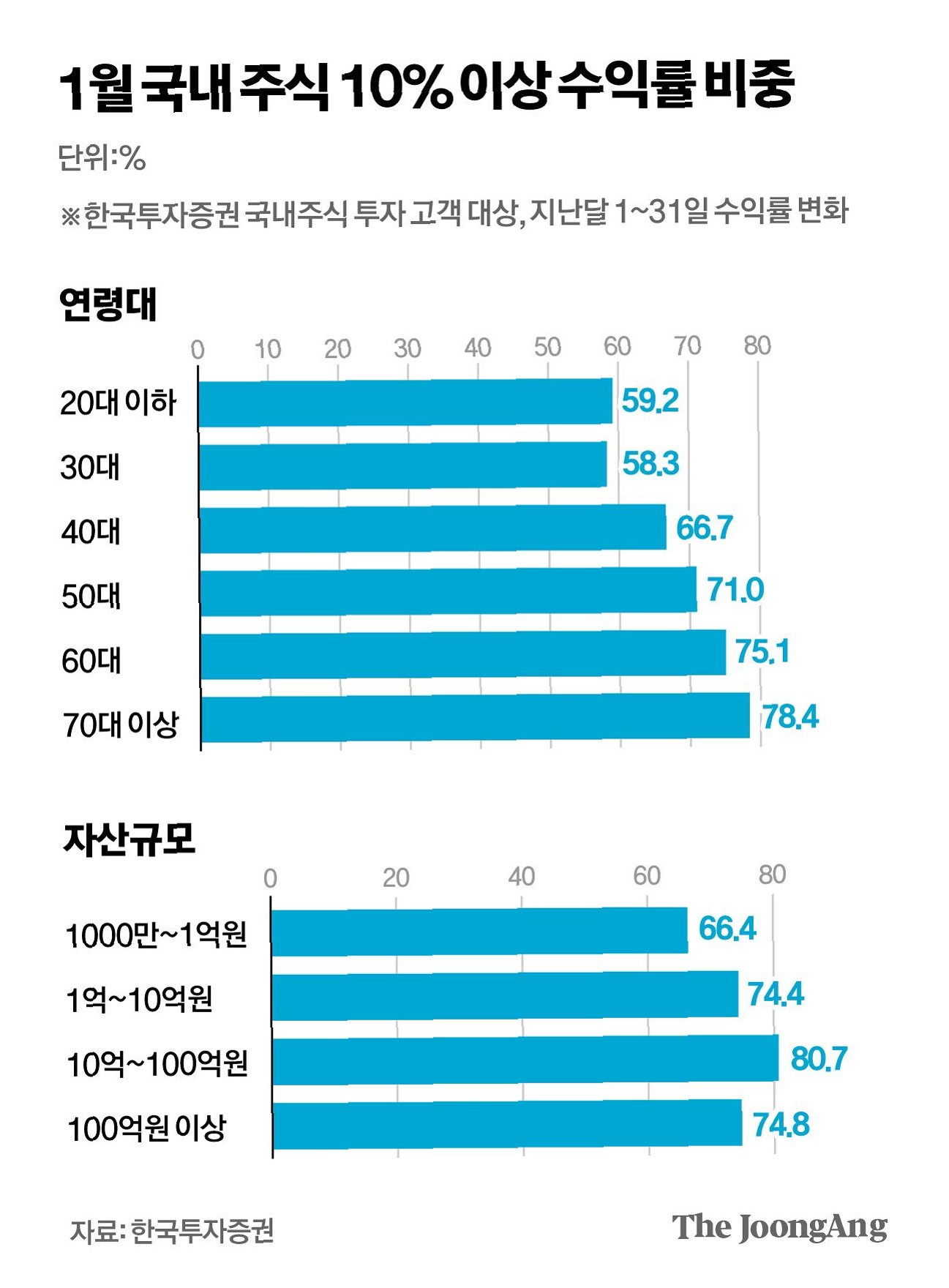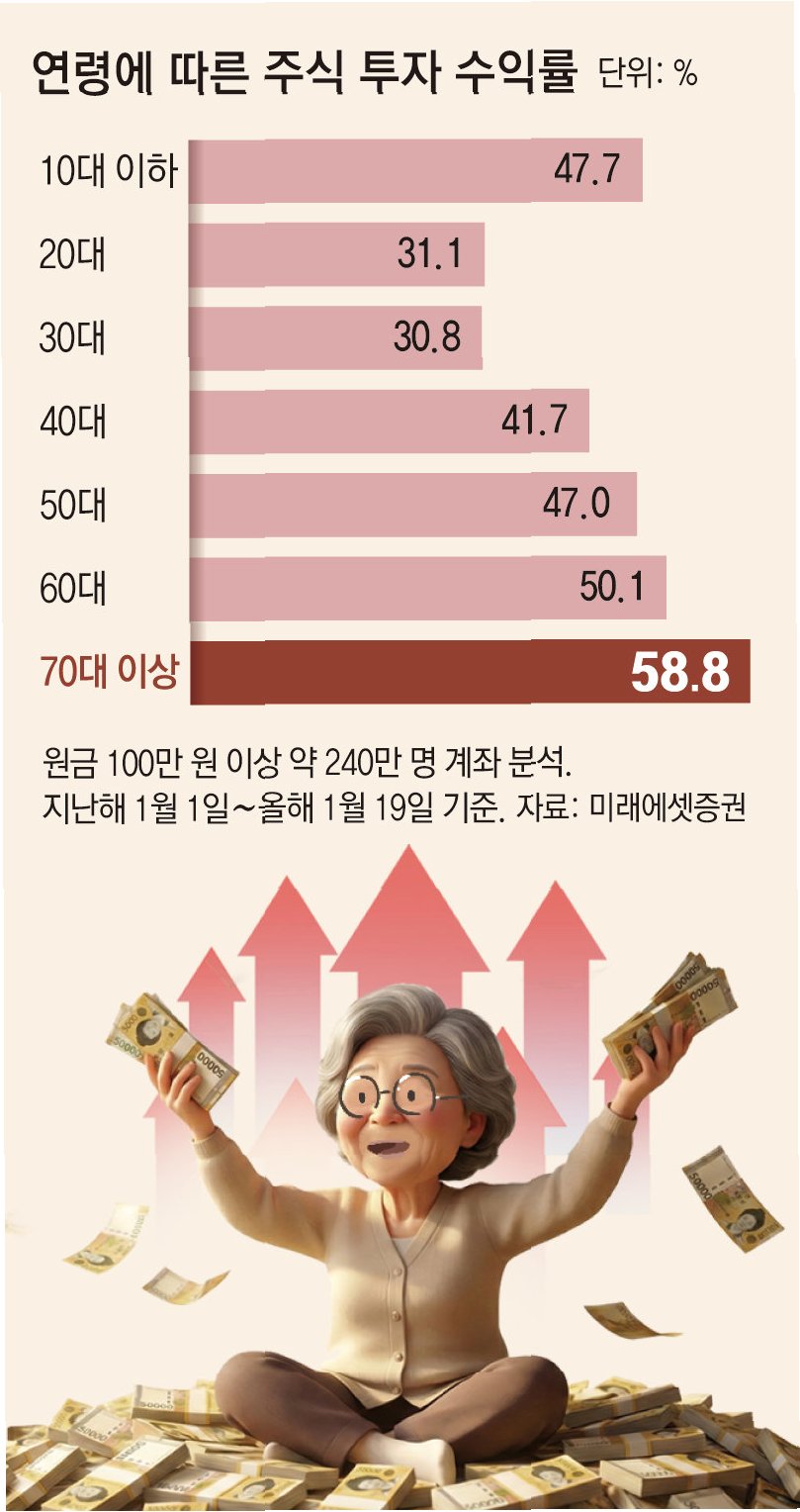 삼성증권이 지난해부터 올 초까지 투자금 100만 원 이상 주식 거래 고객 230만 명을 분석한 결과, 60대 투자자의 수익률이 71.8%로 가장 높았으며, 70대, 50대 순이었습니다. 반면 30대 투자자의 수익률은 54%로 가장 낮았는데, 이는 코스닥 상장주나 게임주 등 변동성이 큰 종목에 투자했기 때문입니다.
