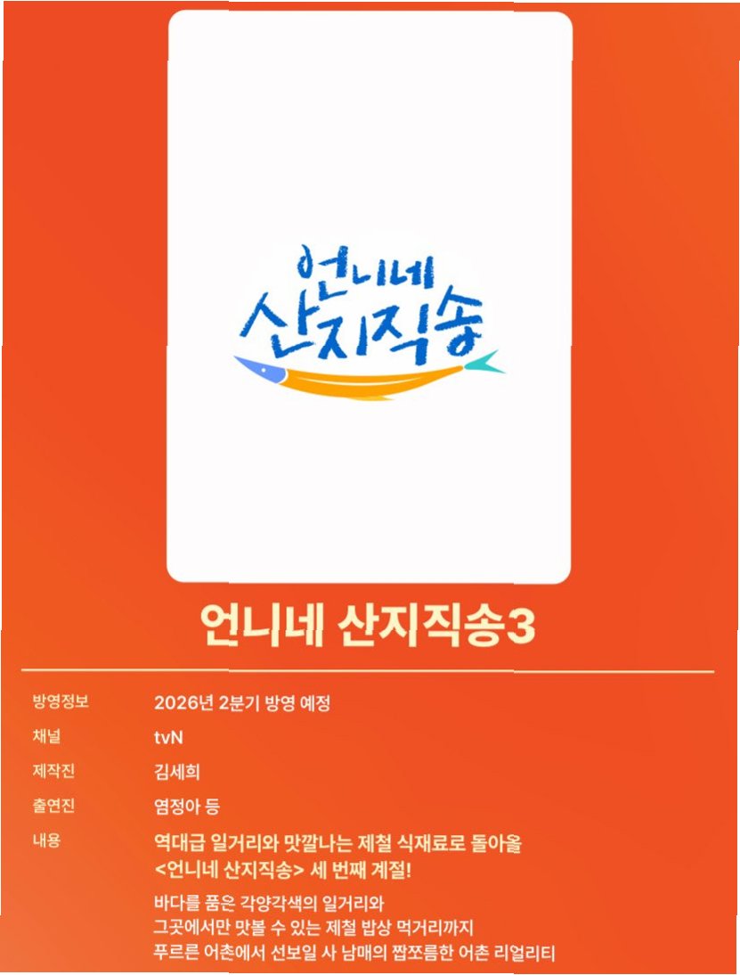 A.'언니네 산지직송 스핀오프'는 오는 4월에 편성될 예정입니다.